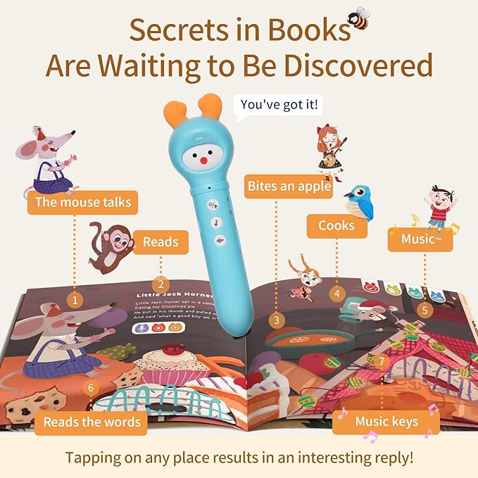 Alilo tidlig pedagogisk lesepennsett kan brukes av barn i alderen 2-6 år. Ved å trykke pennen på et bilde eller ord, vil pennen lese alt for deg. Settet med 3 barnerimbok, 100 flash-kort, ABC-læringskort og pianokort, lar barn lære og lese gjennom spill, aktiviteter for å hjelpe småbarn med å snakke, utvikle logisk tenkning.